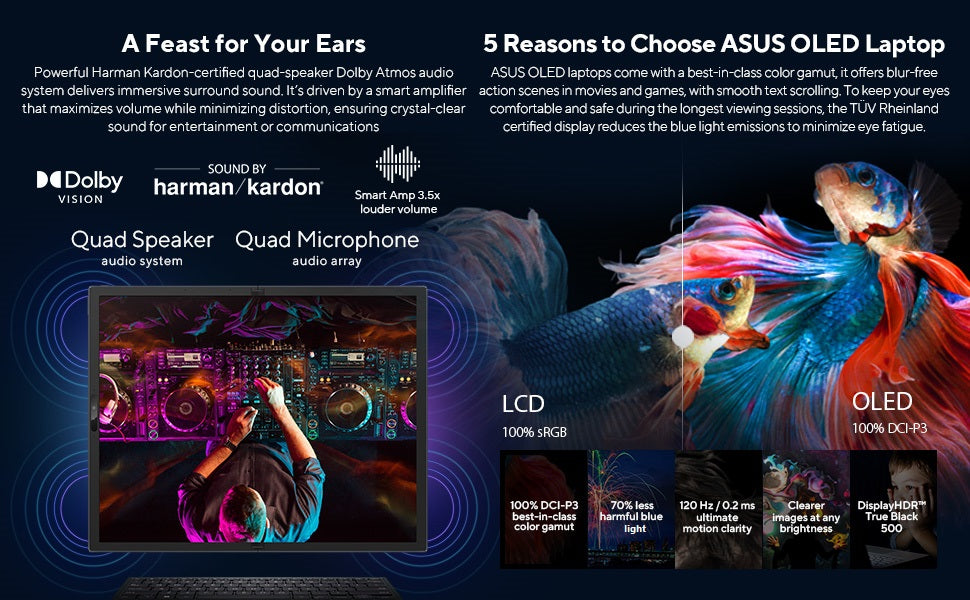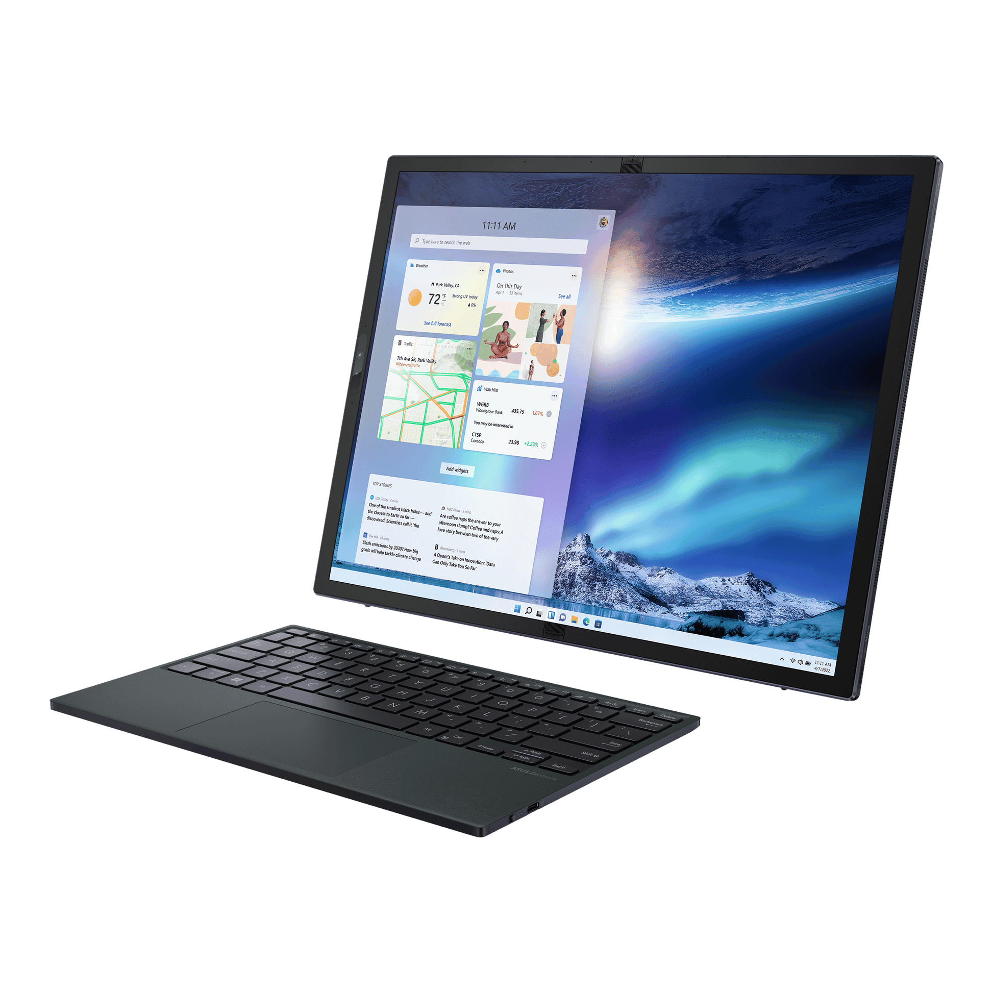 ASUS Zenbook 17 Fold OLED leads the world with its amazing 17.3” Foldable OLED touchscreen that folds down instantly to a compact 12.5” size, making it smaller than a sheet of photocopier paper for easy carrying. The color-accurate 2.5K slim-bezel NanoEdge Dolby Vision screen is also PANTONE Validated with TÜV Rheinland-certified low blue-light levels. Its ingenious multiple user modes are limited only by your imagination, and the detachable ASUS ErgoSense Bluetooth keyboard and touchpad turns it into a powerful fully-featured laptop with a 12th Gen Intel Core processor and a stunning Harman Kardon-certified quad-speaker Dolby Atmos audio system. The innovative camera system includes a 5 MP webcam, a HD IR camera for fast face login, and a color sensor for automatic brightness and color temperature control.