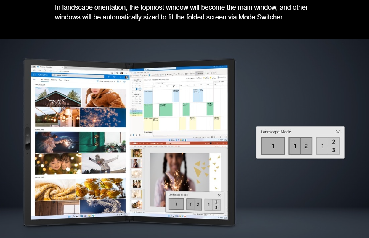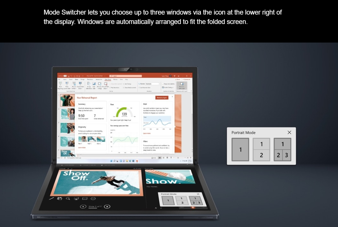 - A new hybrid of laptop and tablet with on-screen keyboard mode, laptop mode, PC mode, tablet mode, book mode and extend mode