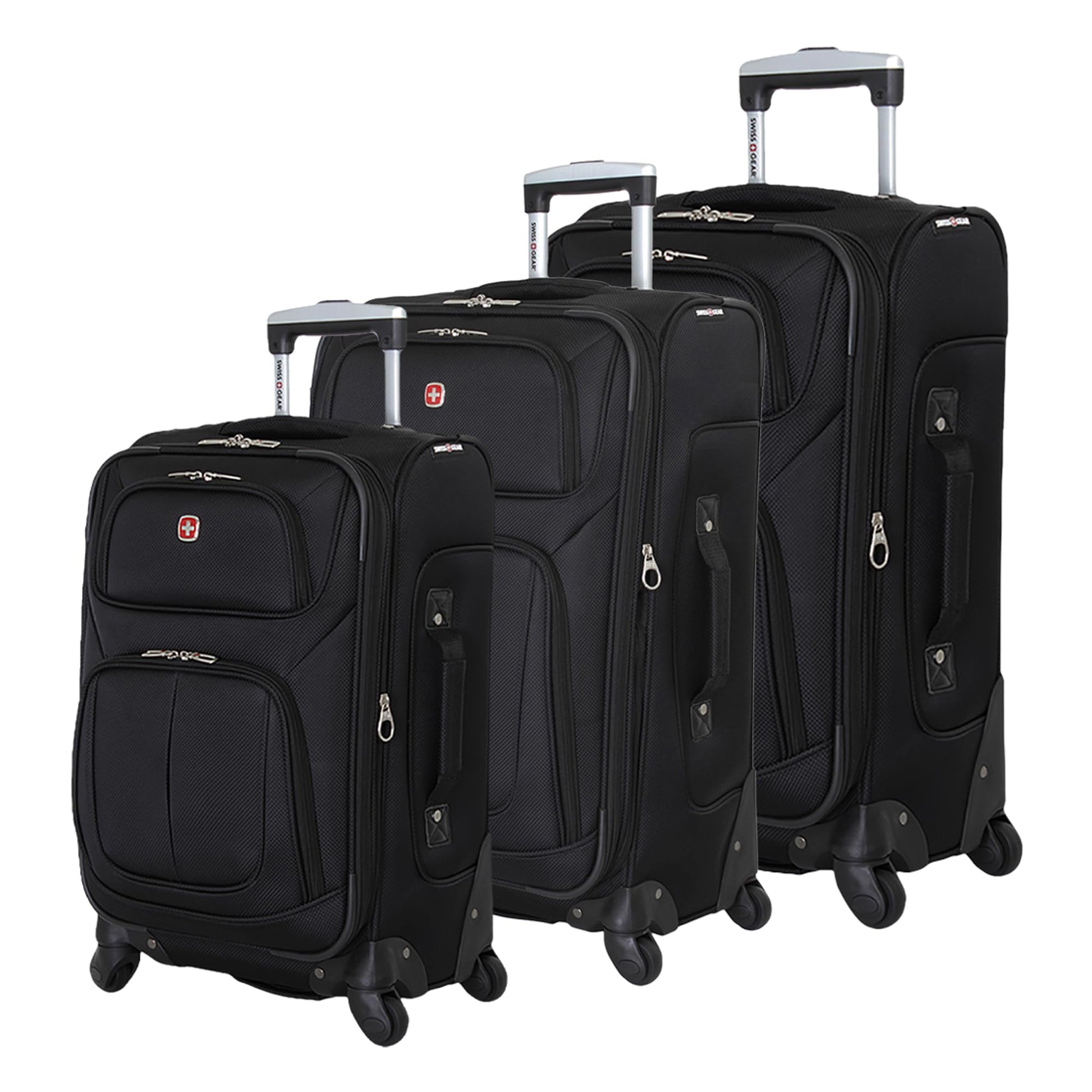 The SwissGear Sion Expandable Spinner Luggage Collection features a locking push/pull handle system and four 360-degree spinner wheels for superior mobility. Made of durable, scuff-resistant polyester fabric, its interior is fully lined and features adjustable luggage tie-down straps, a removable zippered wet bag, a large mesh lid pocket, and a packing pocket for holding small items and accessories. Other features include two front panel pockets, a built-in ID tag, and a padded top grab handle.